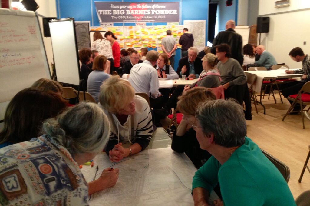 Our first big step was the Big Barnes Ponder in 2013, a community “Charrette” where hundreds of people came together to talk about what they wanted for the High Street, the wider village, and our green spaces. Our professional facilitation team helped us turn ideas into a shared vision – not just physical improvements but also ways of supporting businesses and attracting visitors. Out of it came action teams so residents could stay involved in delivering projects.